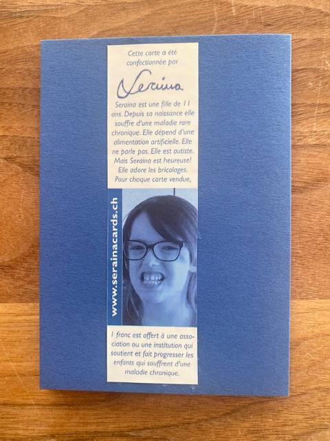Au verso de la carte une étiquette et appliquée. Elle contient une petite explication de la maladie de Seraina et le geste caritatif qui suit à la vente de ses cartes.